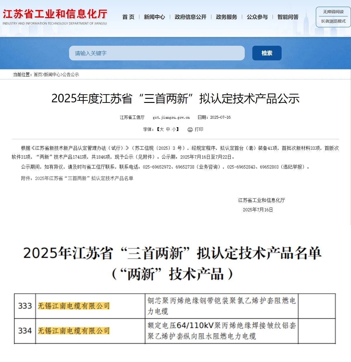 近日,江蘇省工信廳公示2025年度江蘇省“三首兩新”擬認(rèn)定技術(shù)產(chǎn)品名單,無錫江南電纜有限公司“銅芯聚丙烯絕緣鋼帶鎧裝聚氯乙烯護(hù)套阻燃電力電纜”和“額定電壓64/110kV聚丙烯絕緣焊接皺紋鋁套聚乙烯護(hù)套縱向阻水阻燃電力電纜”被認(rèn)定為“兩新”技術(shù)產(chǎn)品。