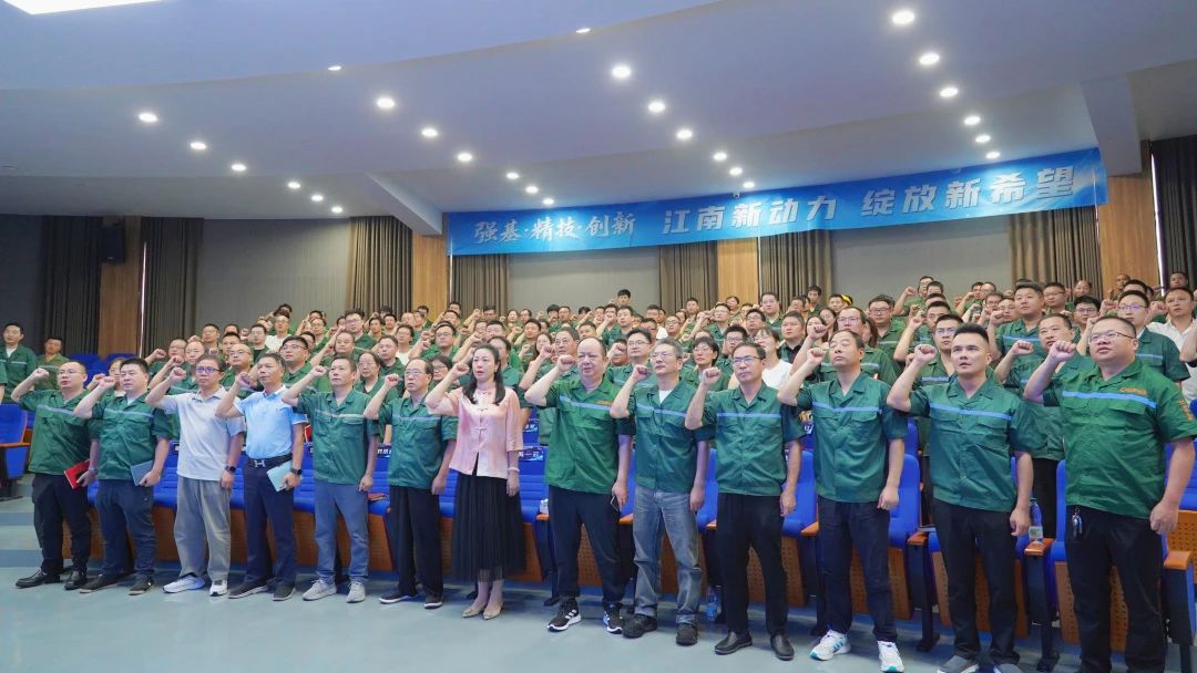 全體成員起立,以莊重姿態(tài)宣讀誓詞:勇于挑戰(zhàn)、奮戰(zhàn)競(jìng)賽、致力創(chuàng)新、以終為始,鎖定目標(biāo)知行合一,滿懷奮斗激情,永遠(yuǎn)做江南新的動(dòng)力,綻放新的希望!